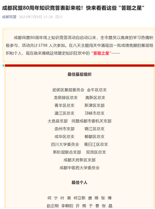 近期,民盟西华大学总支捷报连连,四位盟员在各自领域深耕不辍,接连取得突出成绩,共计荣获六项殊荣,充分展现了盟员们卓越的专业素养、创新精神与服务社会的责任担当。