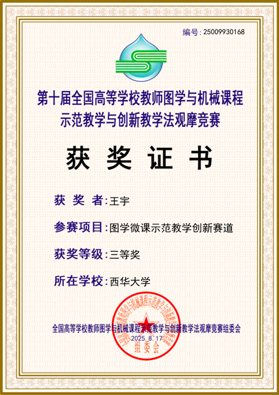 民盟盟员、机械工程学院博导王宇副教授喜获双奖。在科研方面,其主持项目“声纳检测及安全评价系统”荣获中国发明协会颁发的发明创新奖二等奖。该项目针对国家能源储备安全中的关键检测难题,实现了理论、方法到工程应用的多重突破,达到国际先进水平,具有重大应用前景。在教学方面,王宇副教授在第十届全国高等学校教师图学与机械课程示范教学与创新教学观摩竞赛中,荣获“图学微课示范教学创新赛道”三等奖,体现了其在教学创新上的积极探索。